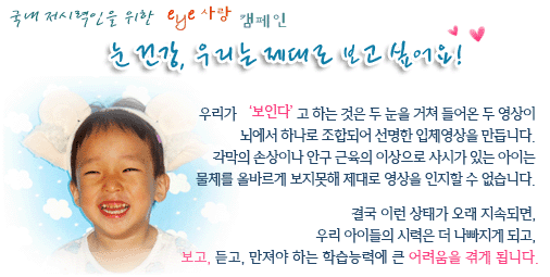 지금 어디선가에서 많은 아이들이 밝은 세상과의 통로를 점차 잃어가고 있습니다. 우리아이들의 ‘볼 권리’를 우리 손으로 지켜주고 싶습니다.