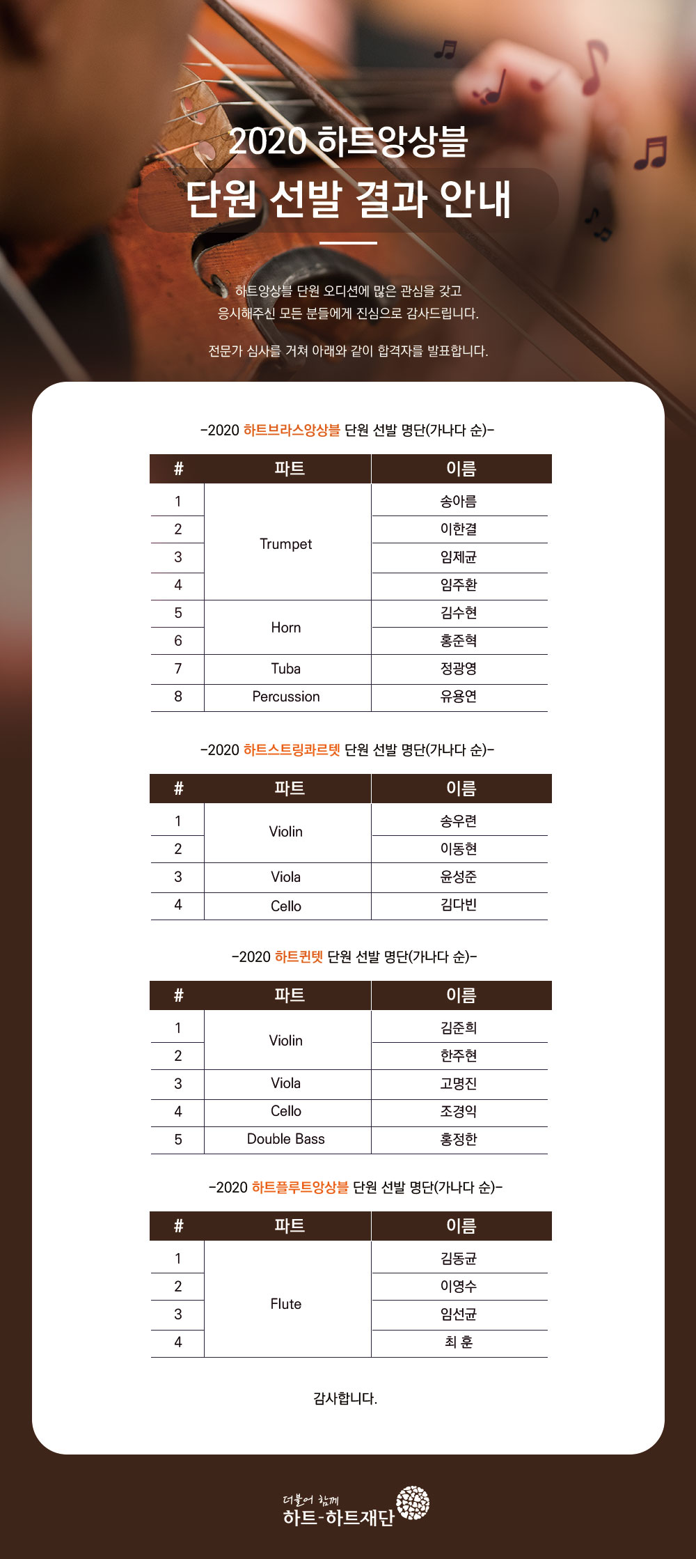 2020 하트하트오케스트라 단원 선발 결과 안내